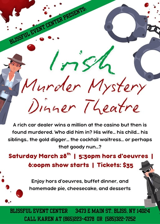 MARCH 28TH, SAT–BLISSFUL EVENT CENTER–ST PATTY’S Day Murder Mystery